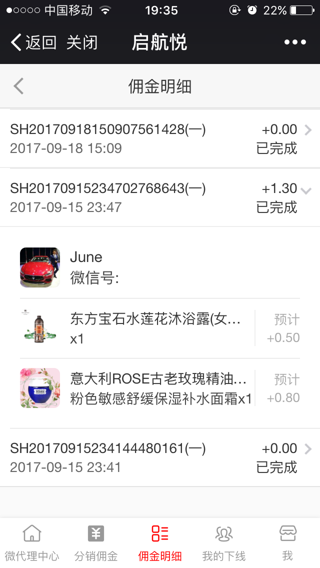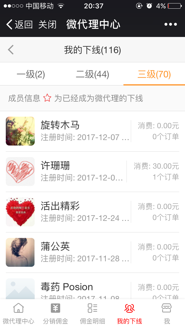 分銷商詳情支持查看某分銷商所有分銷訂單信息、發(fā)展的所有下線以及傭金數(shù)量